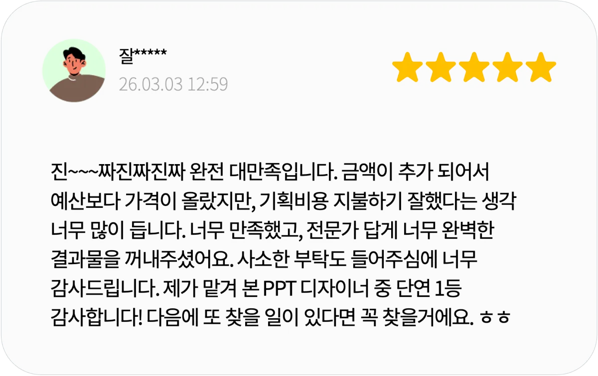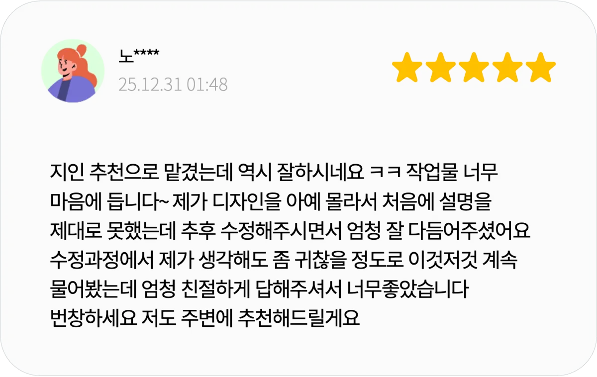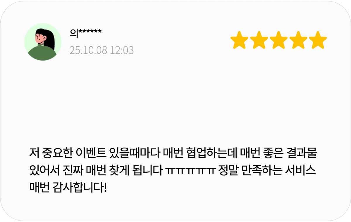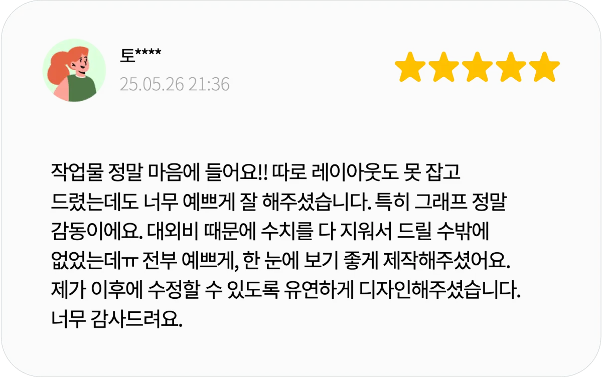 리서치나 전문 자료 조사까지 포함되는 서비스는 아니며, 디자인 작업 역시 제공된 내용과 자료를 기반으로 진행됩니다.