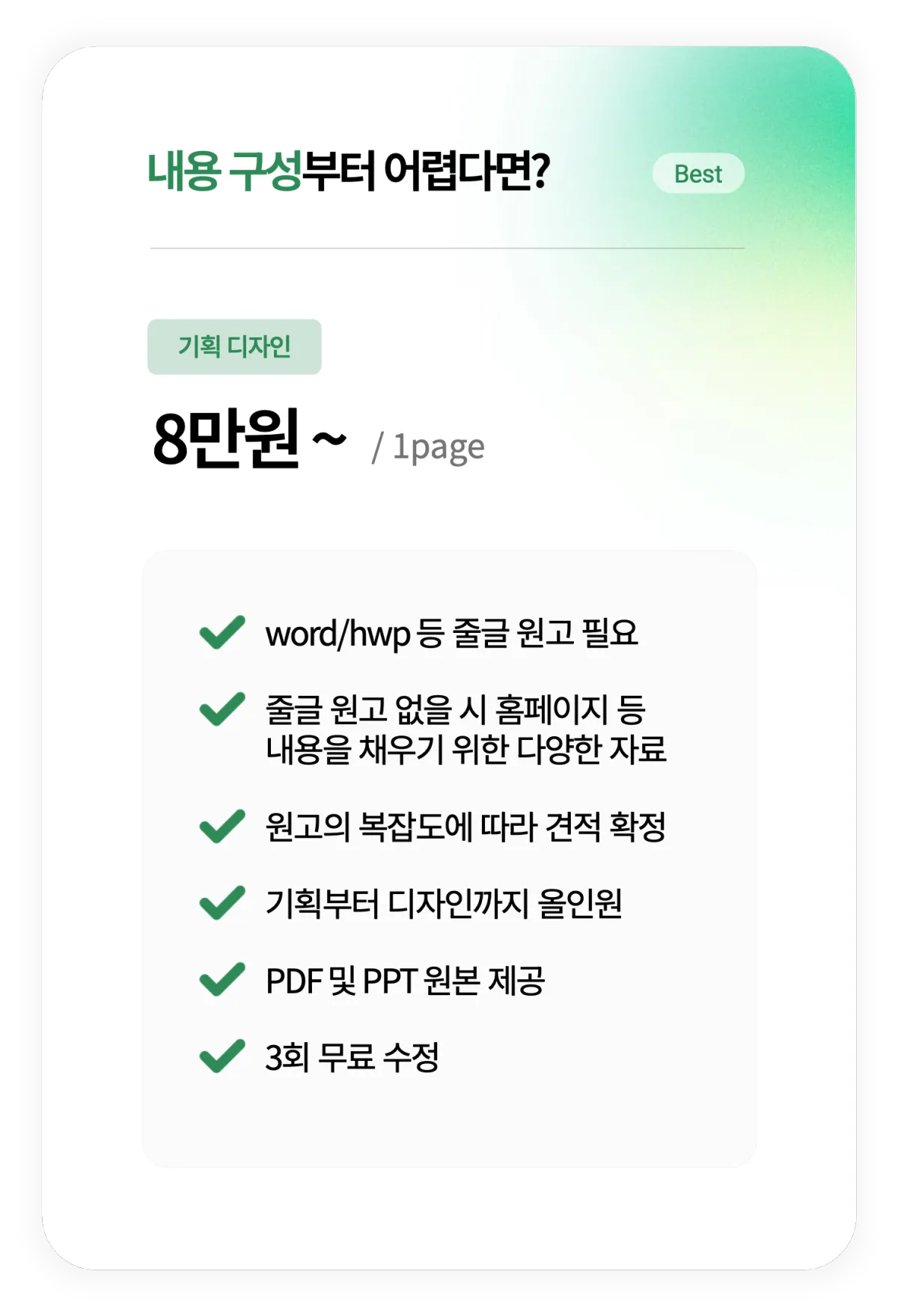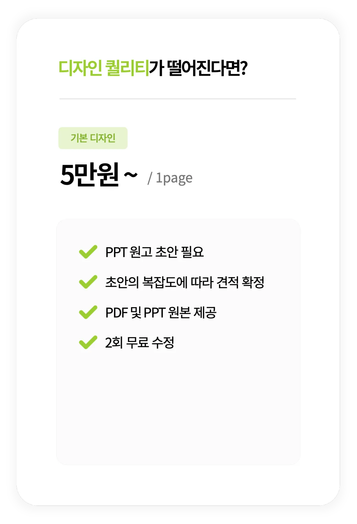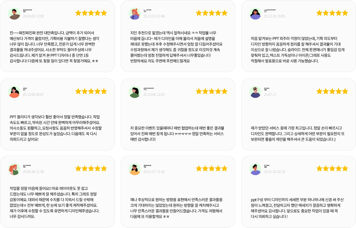 리서치나 전문 자료 조사까지 포함되는 서비스는 아니며, 디자인 작업 역시 제공된 내용과 자료를 기반으로 진행됩니다.