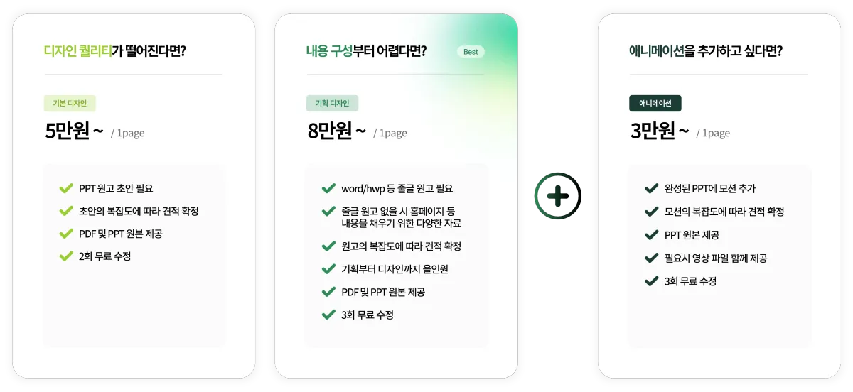 자료의 분량, 원고 상태, 작업 범위(기획, 디자인, 애니메이션 등)에 따라 견적이 달라집니다.